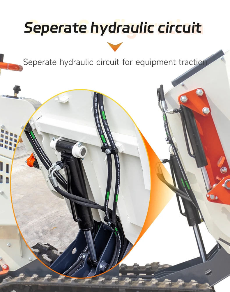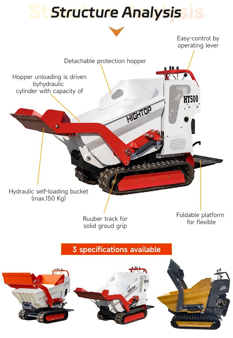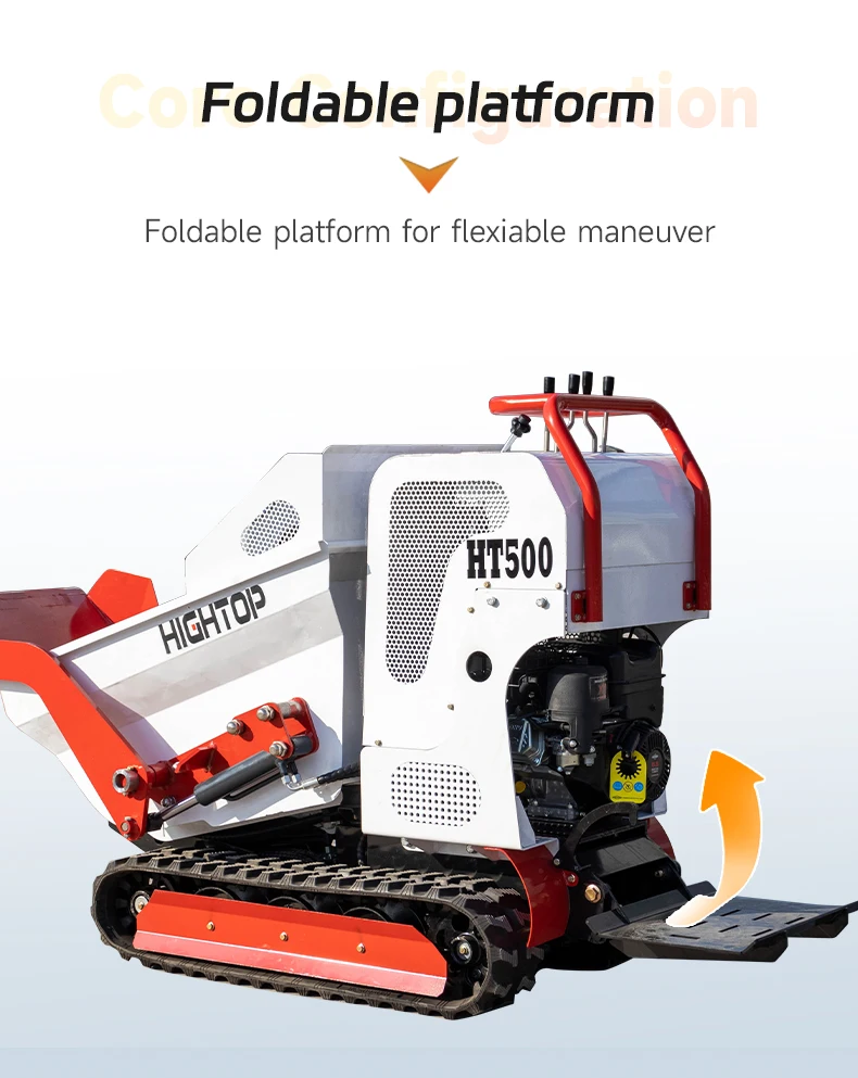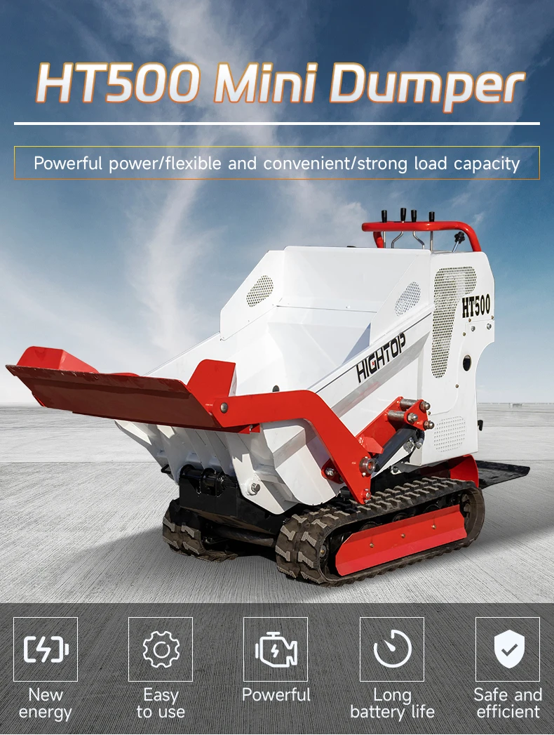 Der selbstladende Minidumper mit Raupenfahrwerk HT500 ist ein wichtiges Gerät für Bau-, Umschlag- und Gartenarbeiten. Mit einer Tragfähigkeit von 600 kg und einem integrierten Betonmischer ermöglicht er den einfachen Transport und das Mischen von Materialien auf jedem Gelände.