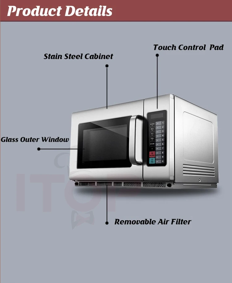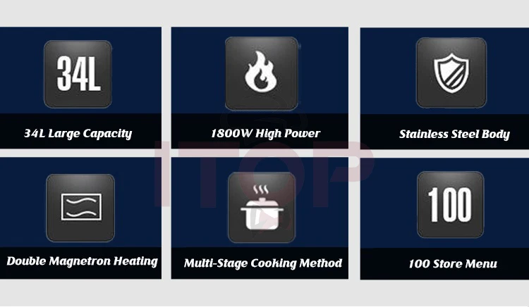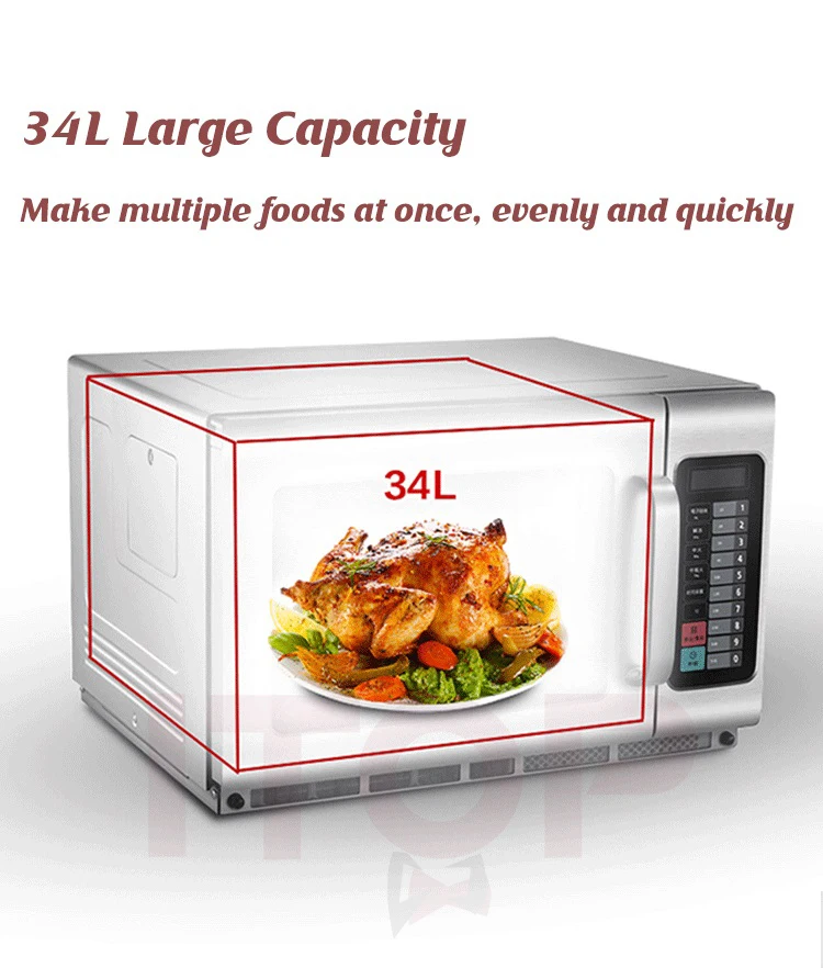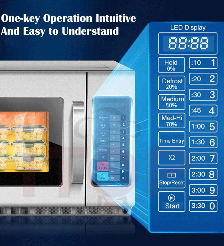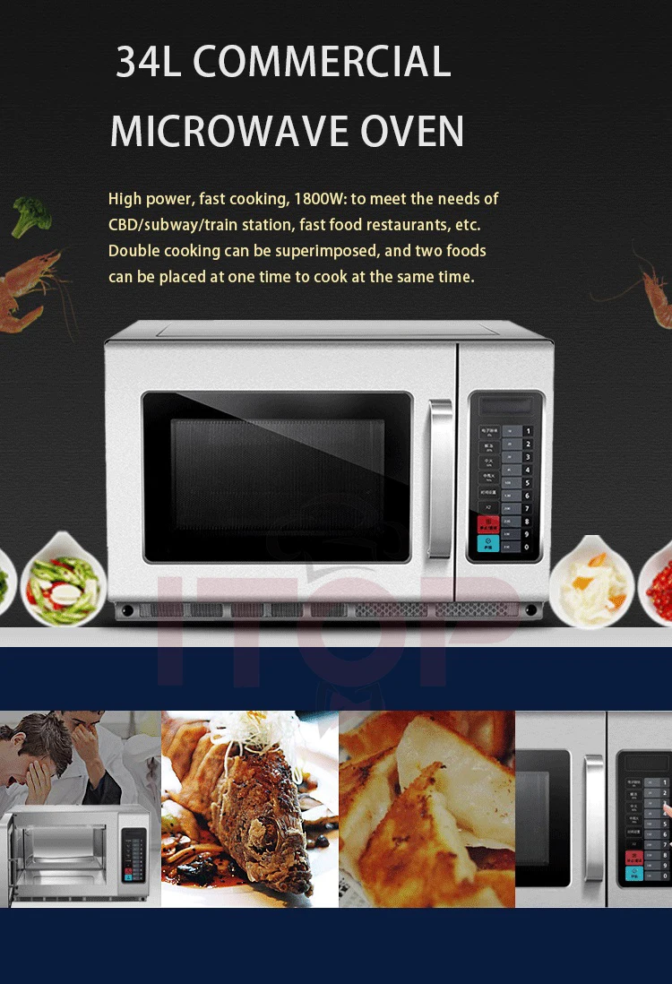 Die gewerbliche Mikrowelle IT-CMO34L ist die ideale Lösung für Gastronomiebetriebe, Hotels und andere gewerbliche Einrichtungen, die ein leistungsstarkes und zuverlässiges Gerät benötigen. Mit einem Fassungsvermögen von 34L und einer Leistung von 1800W können Sie dank der Dual-Cooking-Funktion zwei Gerichte gleichzeitig zubereiten. Dieses Modell ist mit einem fortschrittlichen Wärmeableitungssystem ausgestattet, das für ein besseres Wärmemanagement sorgt und die Lebensdauer des Geräts verlängert, selbst nach 200.000 Türöffnungs- und -schließtests. Aus Edelstahl gefertigt, vereint er Robustheit und Ästhetik und ist dank seines Edelstahlhohlraums und der mikrokristallinen Keramikplatte leicht zu reinigen. Außerdem ist er dank der digitalen Steuerung und des Touchscreens sehr bequem zu bedienen und ermöglicht eine einfache Einstellung der Zeit und der Leistungsstufen (0%, 20%, 50%, 70%, 100%). Dieser Ofen verfügt über drei Kochstufen: hohe, mittlere und niedrige Leistung, um sich an alle Arten von Zubereitungen anzupassen. Mit einer Speicherkapazität von 100 Menüs spart er Ihnen Zeit, indem er Ihre bevorzugten Kocheinstellungen speichert. Dieses Modell wurde entwickelt, um intensiver Nutzung standzuhalten, und bietet gleichzeitig gleichmäßiges und schnelles Kochen für maximale Effizienz in professionellen Umgebungen.Technische Daten: