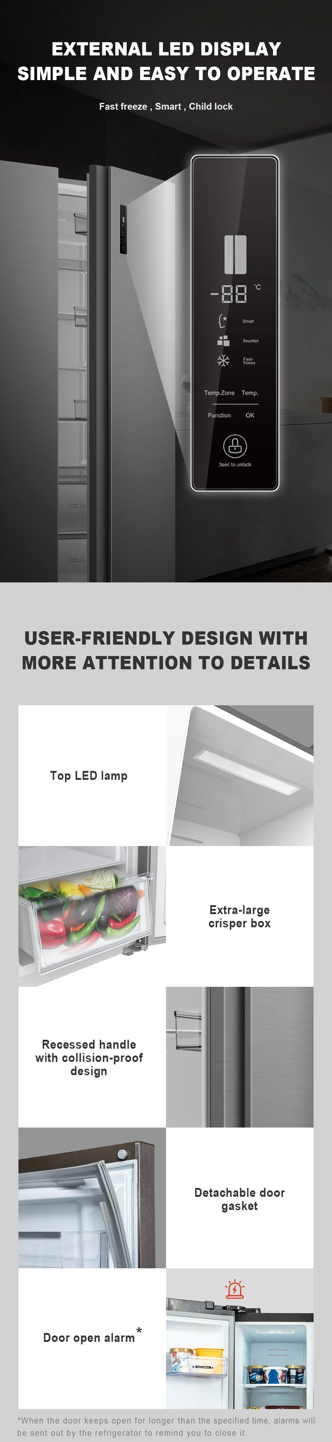 - Gesamtkapazität: 608L, davon 413L für den Kühlschrank und 195L für das Gefrierfach.