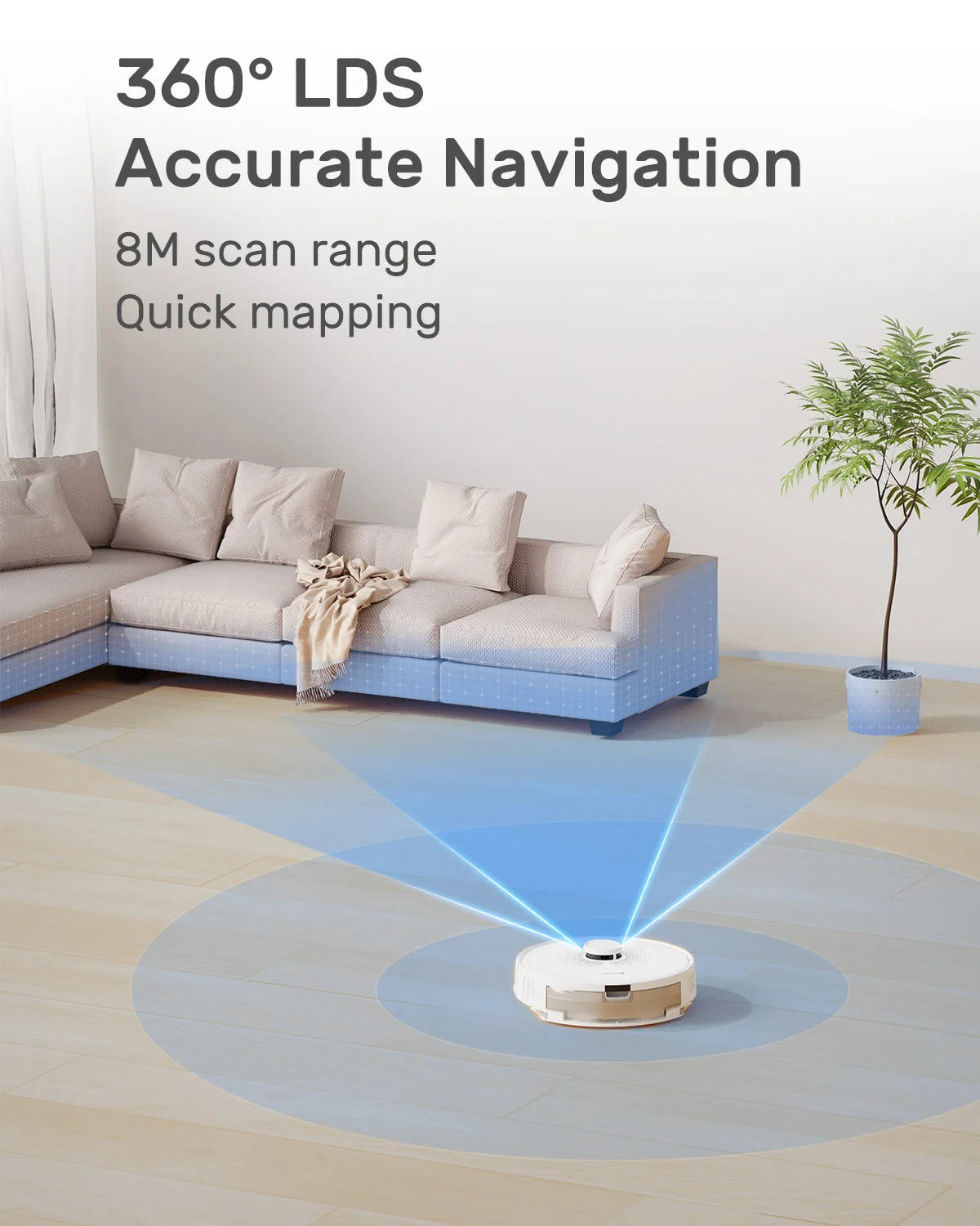 Der Staubsaugerroboter M20m Plus ist eine intelligente Reinigungslösung für Ihr Zuhause, die Kraft, Autonomie und fortschrittliche Technologie vereint. Dieses Modell ist mit einer starken Saugleistung von 4000 Pa ausgestattet, die Staub, Tierhaare und andere Verschmutzungen auf allen Bodenarten effektiv entfernt. Er bietet eine gründliche Reinigung dank seiner LDS-Navigationstechnologie (Laser Direct Sensing), mit der er Ihre Wohnung kartografieren und flüssig und präzise navigieren kann. Dieser Roboter verfügt über einen 5000mAh Li-Ionen-Akku, mit dem er auf Hartböden über 180 Minuten lang ohne Unterbrechung arbeiten kann. Die Reinigung wird durch seinen 250ml-Wassertank optimiert, der ideal für die Nass- und Trockenreinigung ist. Für eine noch einfachere Bedienung bietet der M20m Plus eineSelbstentleerungsfunktion, bei der der Roboter seinen Schmutzbehälter automatisch entleert, sodass Sie ihn nicht mehr häufig bedienen müssen. Diemobile App (Tuya) ermöglicht die vollständige Kontrolle über den Roboter, einschließlich der Verwaltung von Saugkraft, Feuchtigkeit und Reinigungszonen. Außerdem können Sie mit der virtuellen Grenzfunktion Sperrzonen festlegen und für besonders schmutzige Bereiche die punktuelle Reinigung nutzen. Für zusätzlichen Komfort ist der Roboter mit den Sprachassistenten Alexa und Google Assistant kompatibel, sodass Sie ihn ganz einfach in Ihr vernetztes Heim-Ökosystem integrieren können. Der M20m Plus ist auf Praxistauglichkeit und Langlebigkeit ausgelegt. Er ist mit waschbaren EPA E11 Hochleistungsfiltern ausgestattet, die Mikrostaubpartikel und Allergene effektiv einfangen. Das erzeugte Geräusch ist auf 55 dB begrenzt und sorgt so für eine diskrete Reinigung. Darüber hinaus passt er mit seiner automatischen Boost-Funktion die Saugkraft an den jeweiligen Bodentyp an und garantiert so maximale Effizienz auf Teppichen oder Hartböden.Zusätzliche Eigenschaften: