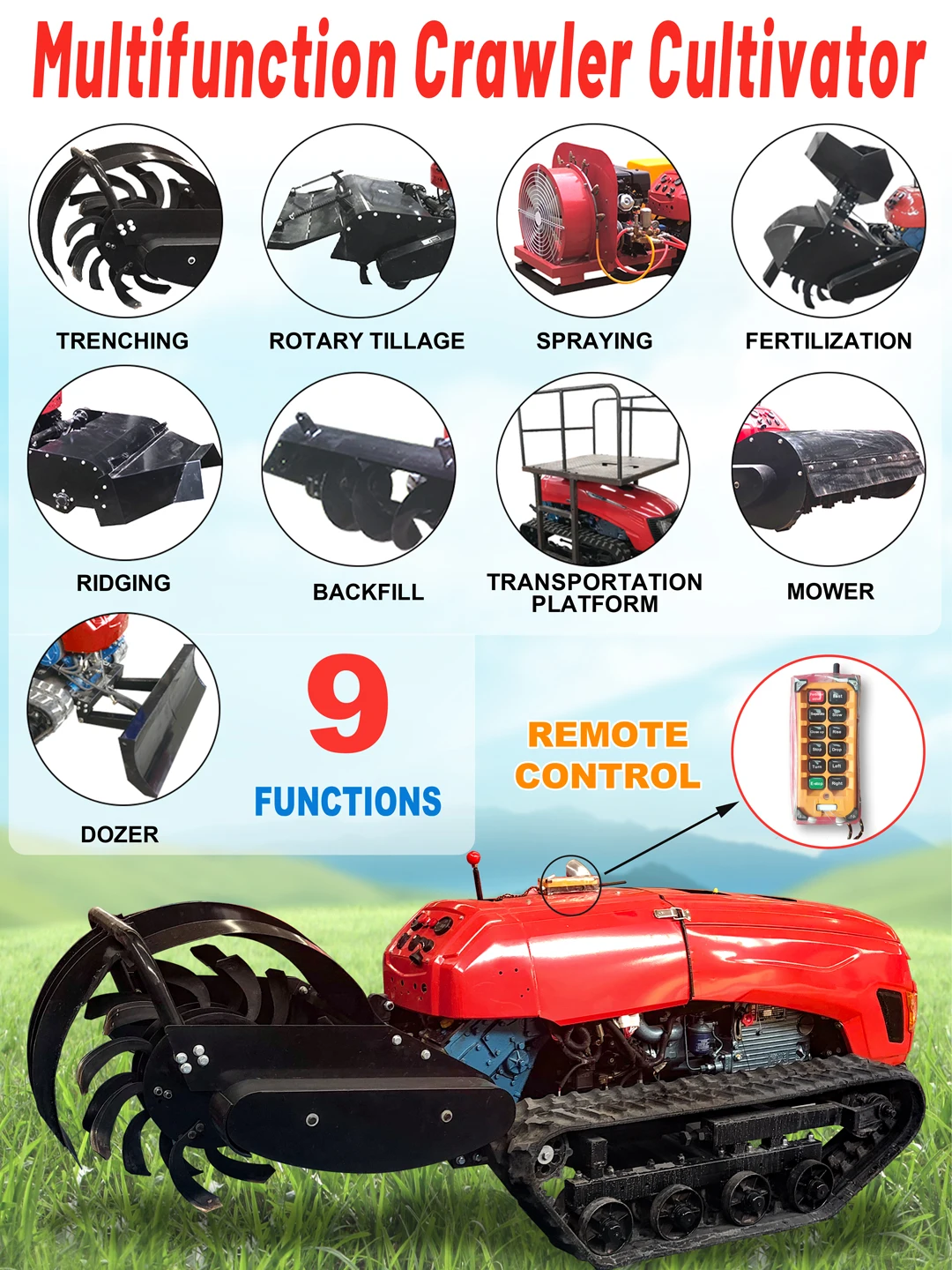 Der ferngesteuerte Multifunktionsgrubber 36HP ist eine innovative und leistungsstarke Lösung für landwirtschaftliche und gärtnerische Arbeiten. Er ist auf hohe Produktivität und intuitive Bedienung ausgelegt und verfügt über eine Reihe von Funktionen, die auf die Bedürfnisse moderner landwirtschaftlicher Betriebe zugeschnitten sind.