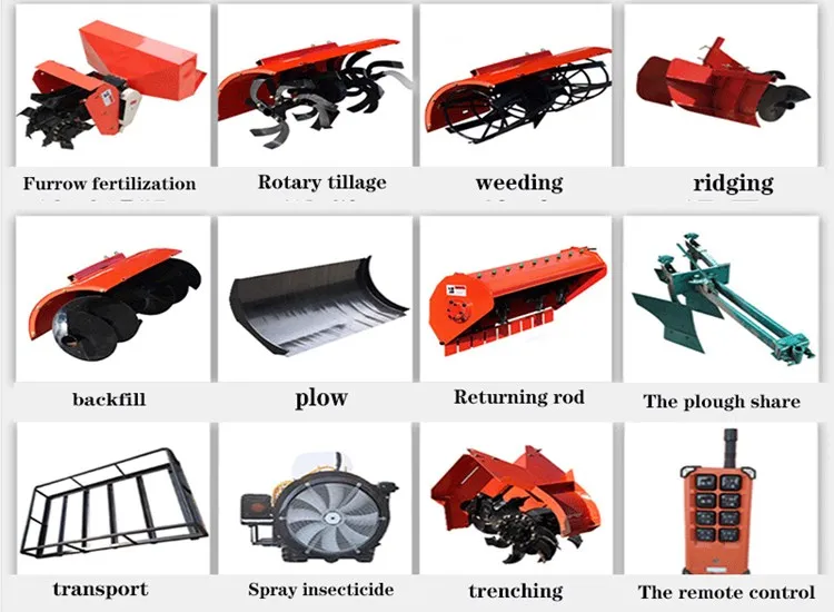 - Wird mit einer Schaufel und fünf landwirtschaftlichen Werkzeugen für verschiedene Arbeiten geliefert: Rotationspflügen, Furchenziehen, Unkrautjäten, Aufschütten, Kreppen, Bulldozer und Transport.